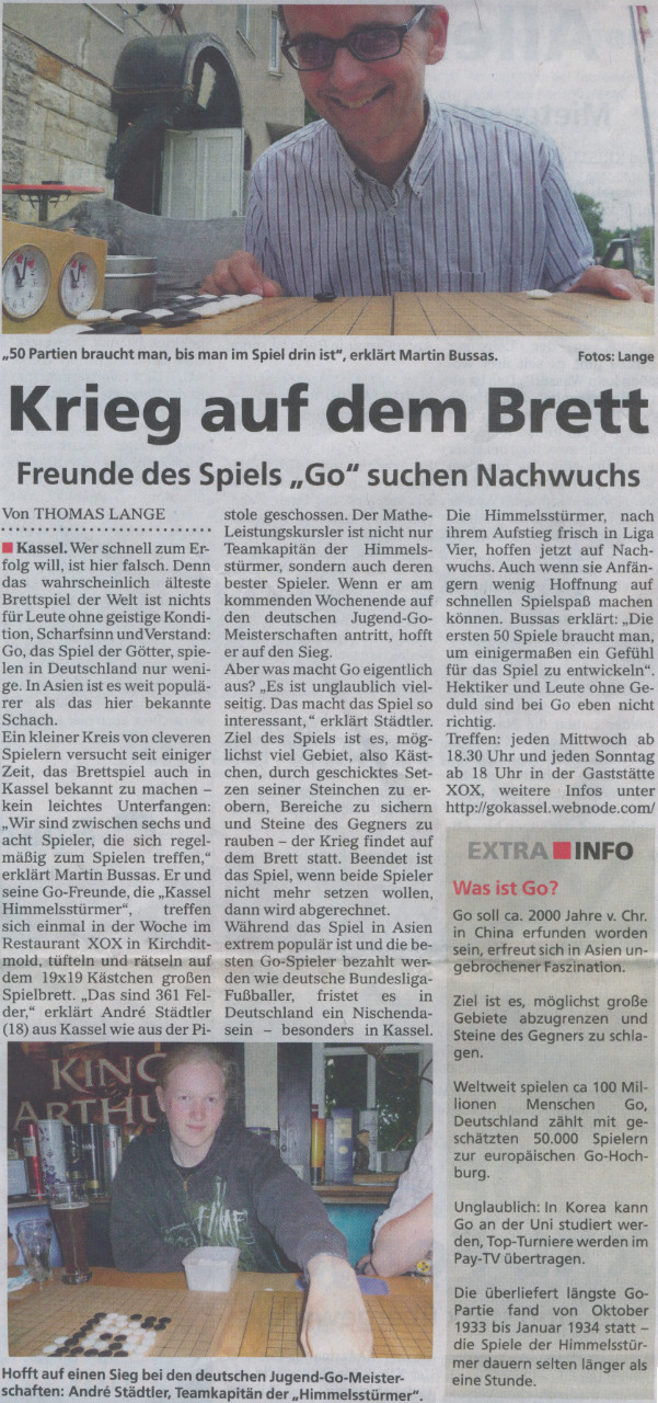 Der Extratip schreibt über die Nachwuchssorgen der Kasseler Go-Spieler am 21. Juni 2011: